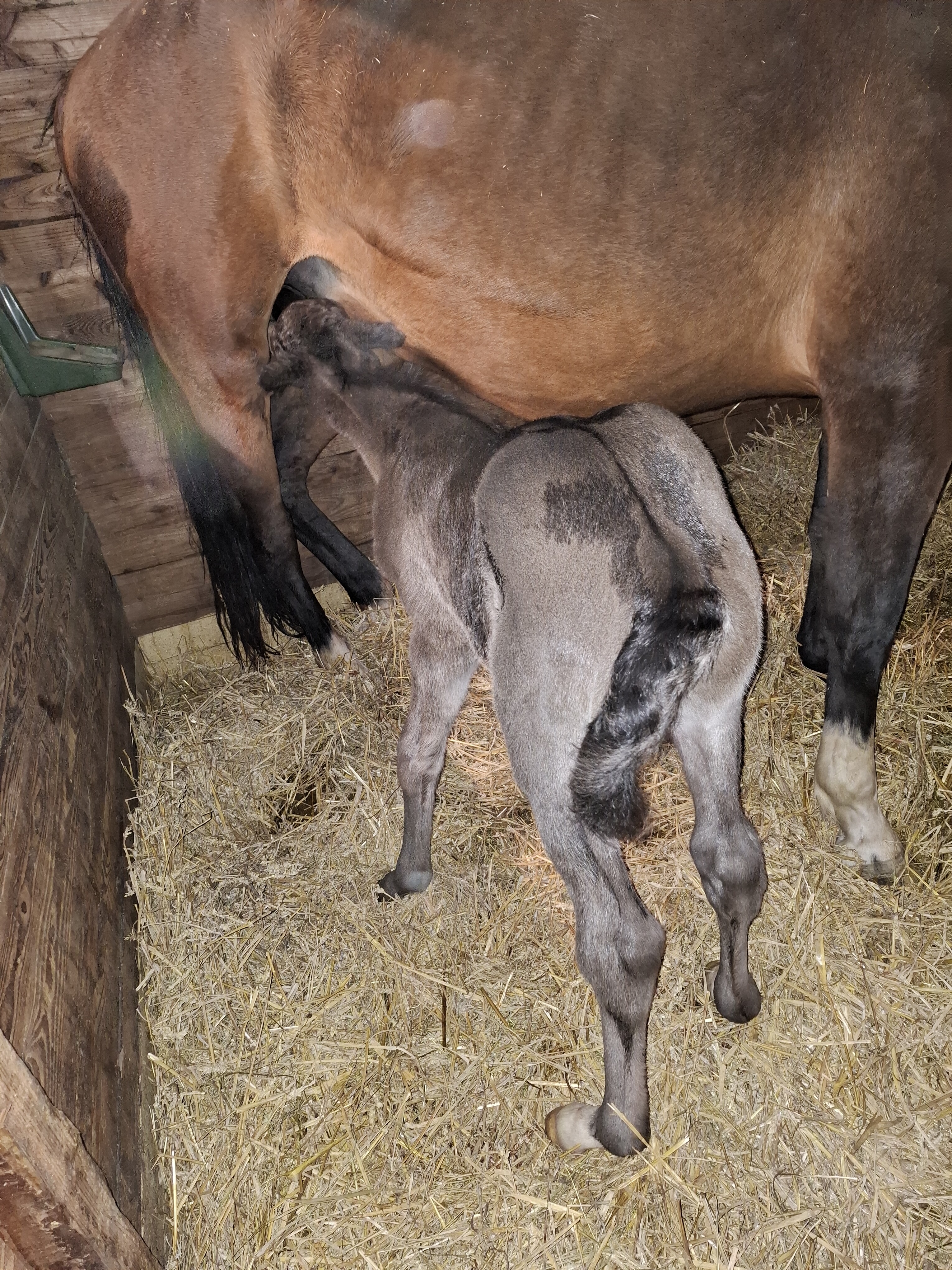 Już..... hodowxa histeryk trochę zatroskał, bo pierworódka nie dość sprawnie radziła sobie ze źrebakiem, ale ostatecznie wszystko odbyło się zgodnie z 1-2-3. Jak tu wytłumaczyć źrebakowi, że ani mama ani tata nie są "czarne"🙃 Casalou PS x Grand Slam VDL. Ma już właścicieli.