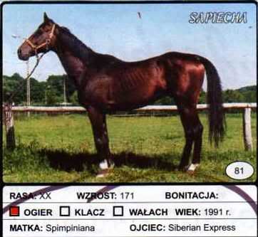 Pytalam w 'poszukiwanych zdjeciach' ale moze bardziej prawdopodobne ze tutaj znajdzie sie ktos kto posiada zdjecia ogiera SAPIECHA xx ( Siberian Express xx & Spimpinina xx) ur 1991, gniady. Albo zna/ł konia i może coś powiedzieć na jego temat :>