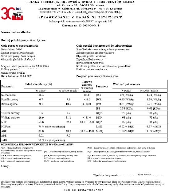 Natomiast co do fachowej opinii, to hippovet ma dietetyków, od razu Ci dietę pod to siano ułożą z suplami i treściwa (ale patrz wyzej czemu za rok mozesz miec totalnie inne siano z tej samej łąki - raczej proces trzebaby powtarzac, przynajmniej w lata suche vs mokre). Albo możesz szukać opinii po uczelniach wśród naukowców zainteresowanych tematem.