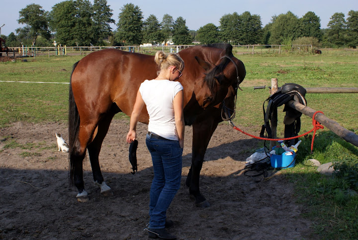 szafirowa, opr za caloksztalt, ze sie tak wyraze. Fakt, ze w tak zwanej dobrej wierze, ale w owej sytuacji zamiast dac mi kopa tylko mnie dobil tak totalnie. Ech.... dobra. Trzeba isc dalej. Zeby historia byla ciekawsza to jeszcze w calym tym zamieszaniu mialam starcie z jedna z tutejszych "postaci". Spadlo oglowie, kobyla nawiala bez niczego na glowie. Biegne za nia, widze, ze ktos ja zatrzymal w takim korytarzy na wyjsciu z toru, a raczej straszy siatka w druga strone, bo chyba sie boi zlapac (teraz juz wiem kto to byl, wiec mnie to nie dziwi skoro wlasnych koni sie boi). Dobiegam, w pedzie zarzucam przestraszonej kobyle wodze na szyje a owa kobieta (z ktora mam na pienku, bo to ona przeprowadzila wtedy mojego konia i ma sie super ze swoim usmiechem, bo nie moge nic udowodnic :/) do mnie z pretensja, ze jej "dzien dobry" nie powiedzialam. Idealnie wykorzystujac sytuacje, ze jestem w ciezkim szoku i raczej nie mam chwilowo glowy na to zeby sie jej odgryzc. :/ Paranoja. Akurat biegnac za koniem bez oglowia analizuje kogo widze na okolo. Ludzie maja cos z glowa. Masz jeszcze ta "szczoteczke". 😉