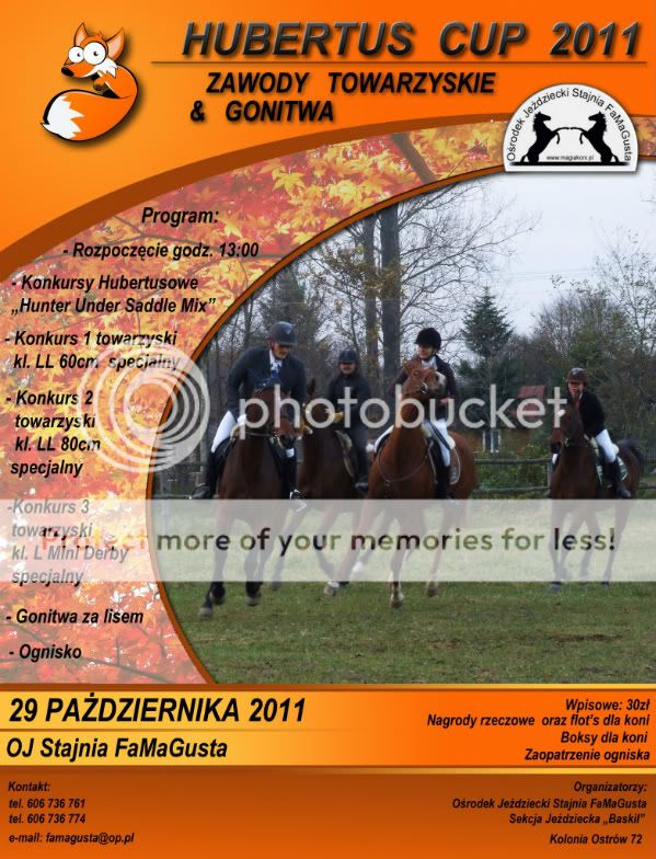 Fotek na razie za bardzo nie mam ale huberts baaardzo fajnie zrobiony , konkursy dla ludzi z nagrodami w postaci karnetu. Pokaz ras koni ,pokaz skoków ,ujeżdżenia. Konkurs z szukaniem lisa dla dzieci. Darmowe kiełbaski ; D Jeszcze tak fajnego hubertusa nie widziałam : D