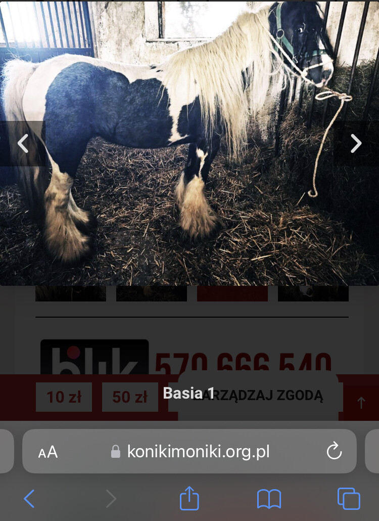 Potem spójrzcie na zdjęcie z boku i por z tym z ich strony - wyglądają jak identyczne konie. Czyli… zbierają na konia Basię który podobno kilka tygodni temu trafił do prywatnej adopcji jako Romuś czy Lucjan czy Oskar. Zdjecia z różnych boków koni ale tyłek identyczny i odmiana na nosie i nogach