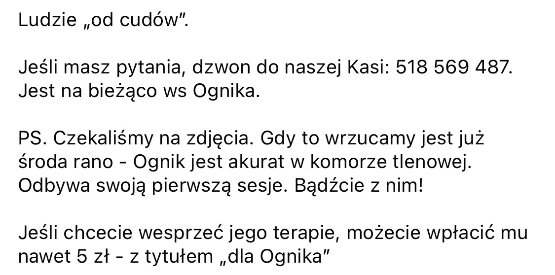 Jak czytam o homeopatii i osteopatii w przypadku tego biednego zwierzęcia to się cieszę, że mnie na fejsie zablokowali, przynajmniej im nic nie napiszę. Ozonoterapia to jedyny pomysł o jakim czytałam na stronie, który jeszcze mógłby mieć sens, gdyby nie to, że takich ran nie przeżyje nikt poza sterylnym środowiskiem...