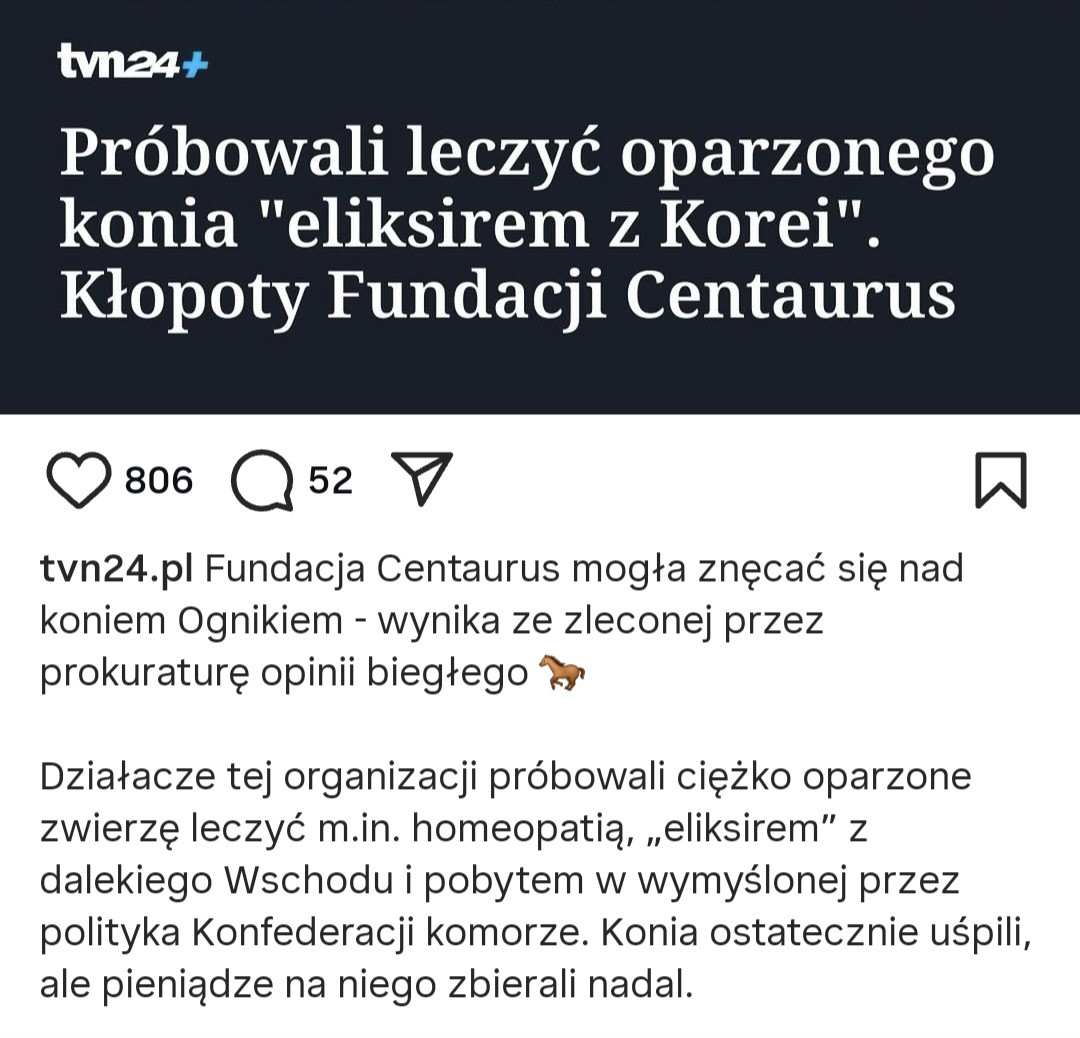Jeśli chodzi o Centaurusa, to liczę, że odpowiedzą za cierpienie tego konia. Jednocześnie wiem jak powalona to jest fundacja i boję się, że w akcie jakiejś paniki czy coś zaczną odbierać z czapy ludziom konie z adopcji. Ludzie sobie odkarmią, odchowają, nauczą tego i owego, zżyją się ze zwierzakiem a tu wpadną oszołomy i mogą Ci odebrać przyjaciela. Szkoda, że w tą stronę żadne prawo nie chroni.. tych zwierząt przede wszystkim, ale no opiekunów koni w adopcji też. Dramat. Ciekawe czy coś jeszcze usłyszymy w tej sprawie czy się rozejdzie po kościach..