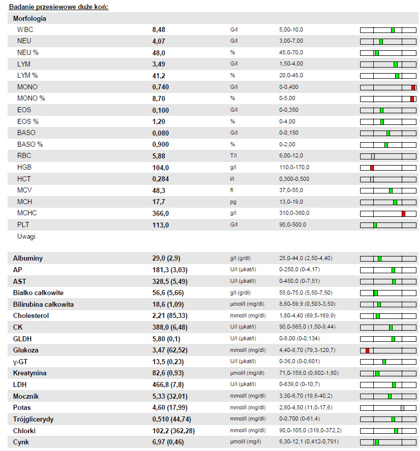 A to wyniki mojej kobyły. Pierwsze co widać w wynikach, to zaawansowane rao. Drugie, to gospodarka żelazem - będę zaraz się doktoryzować w preparatach, bo Audevard Redplex nie podam, ze względu na zawartość selenu, który mamy w wyższej normie. Magnez, mimo ciągłej suplementacji słabiutko (sukces mg z tryptofanem). Poza tym kobył dostaje Reformin. Chętnie dowiem się, co jeszcze widzicie 🙂