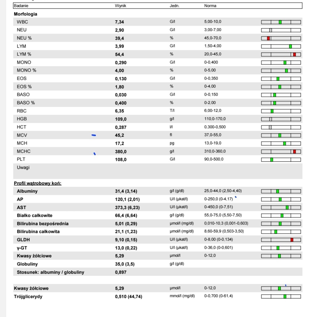 Meise - masz te wyniki krwi bardzo slabe. Wszystkie. To, że coś się mieści w zielonych widełkach nie oznacza, że jest git. Linia nie powinna być "od sasa do lasa, raz z lewej raz z prawej'.