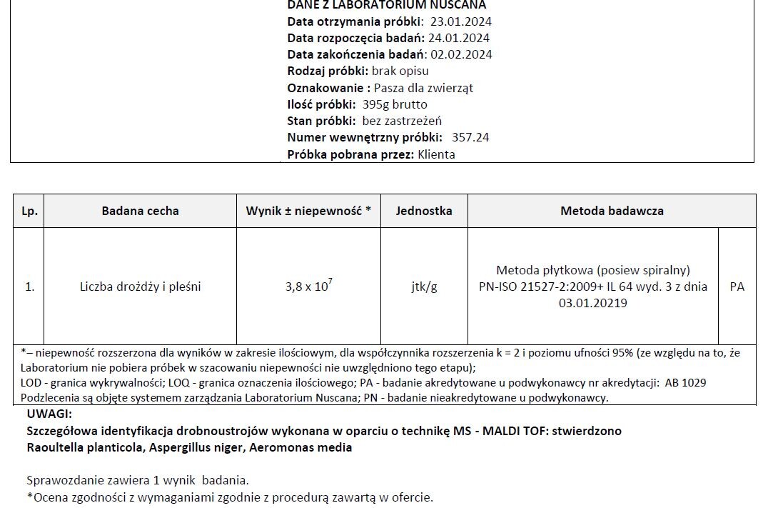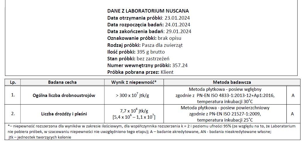 Wrzucam 2 zrzuty ze sprawozdania z badań. Na pierwszym niepoliczalna ogólna liczba drobnoustrojów - jeśli ktoś ma problem z liczeniem to jest tu ponad 3 000 000 000 (miliardy) jednostek tworzących kolonię w 1 gramie badanej paszy, oraz liczba drożdży i pleśni - 7 700 000 jtk w 1 g.