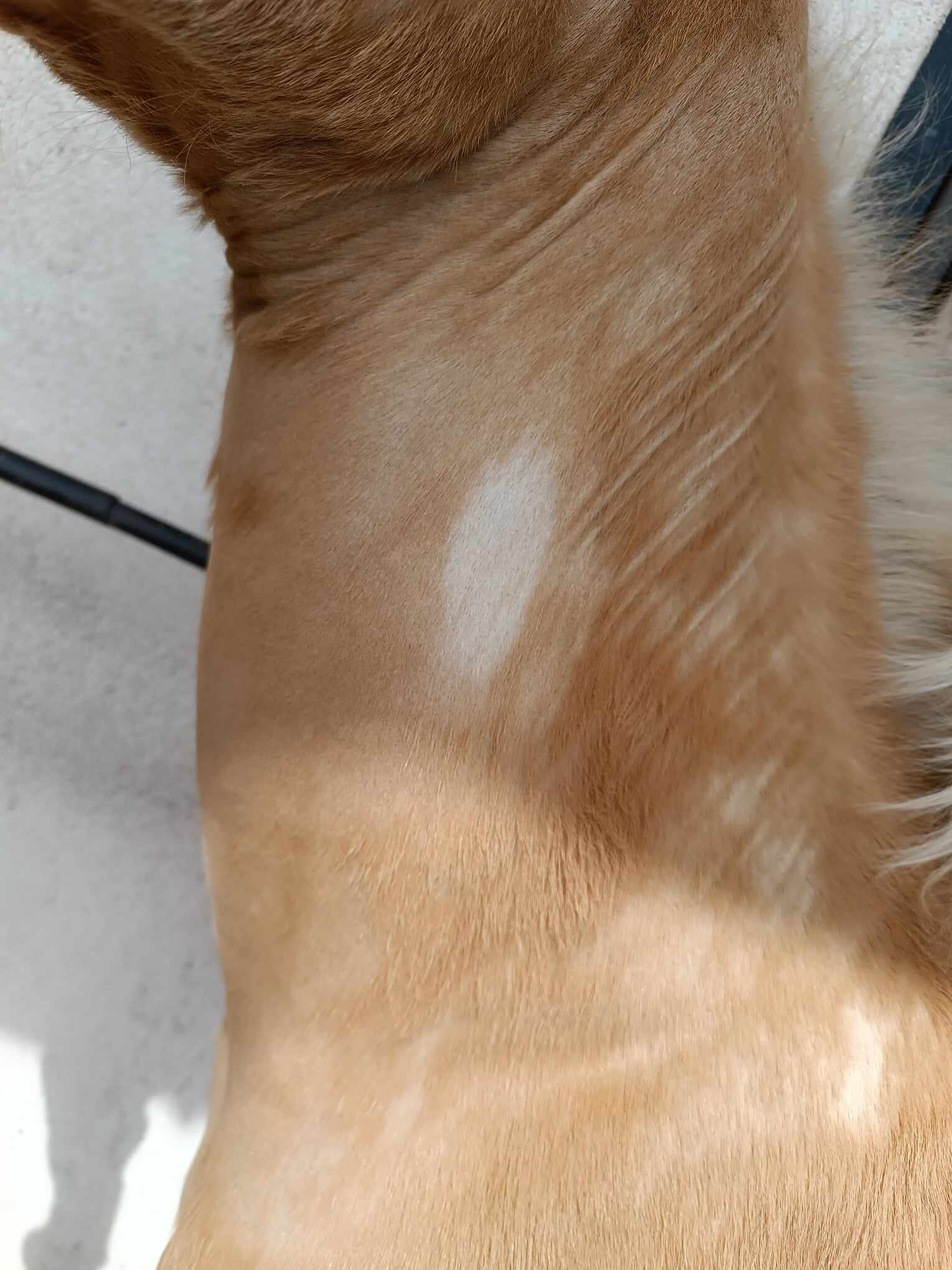 Spotkał się ktoś z taką plamą po wytarciu źrebięcej sierści? Wygląda jak plama bend or, tylko jasna.