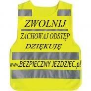 jeśli znak będzie widoczny to napisy (np czarne) nie będą przeszkadzac bo z daleka widac i tak tylko odbłys odblasków. wiec może jednak je dać? będą czytelne "na spokojnie", a znak musi świecić - tzn tak sądze , bo zwykle pasy świecące to mają zwykłe kamizelki - robotników, rowerzystów przy ktorych zwalniać ani az tak uważać nie trzeba.... wiec moze to co najważneijsze - odblaskiem, a informacje dac, ale na czarno - w dzień będa widoczne - czyli wtedy kiedy je mozna przeczytać, po ciemku i tak nie ma czasu - wtedy mysi być oczojebny znak ....