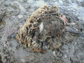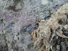 Na zdjęciu widać owcę, która padła przy porodzie... Leżała już jakiś czas a w brzuchu ma nie "niestrawiony pokarm", tylko gazy powstałe w wyniku rozkładu. Nawet nogi sterczą jej w sposób charakterystyczny dla rozkładającego się truchła. Hodowca na medal... dbający o zwierzęta... owieczka widać czysta, zadbana i "najedzona". Że Ci nie wstyd...