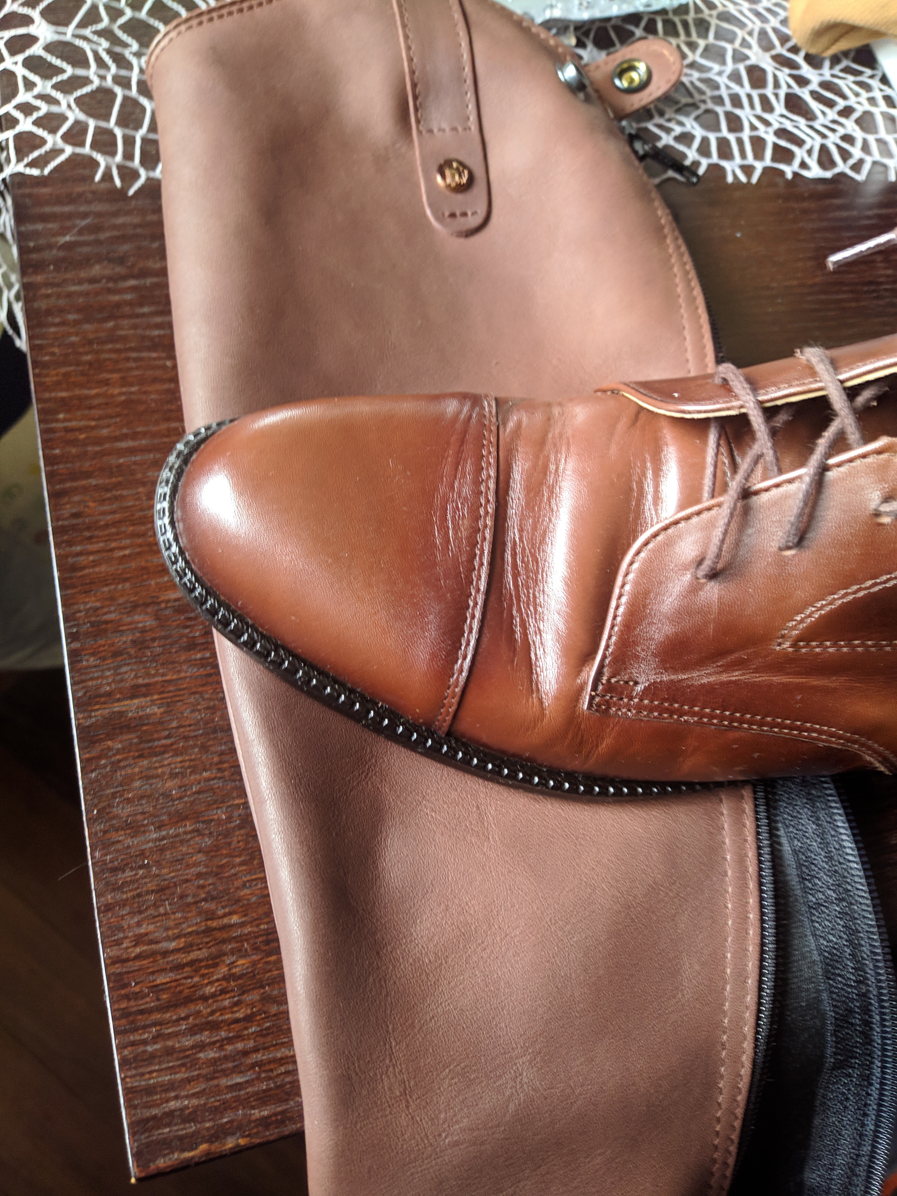 Mój brązowy komplet - sztyblety Elite (z zamkiem) i czapsy Roma pasuje. Jak się bardzo przyjrzałam to może buty minimalnie bardziej błyszczące, czapsy mogę dopolerować do delikatnego połysku, buty trochę mocniej, ale nie na tyle, żeby był dysonans. Tym bardziej, że kolor nie jest całkiem równy i różnice giną. Duża różnica to IMHO podstawa do zwrotu albo wymiany - może sklep dobrał produkty z różnych partii skóry?