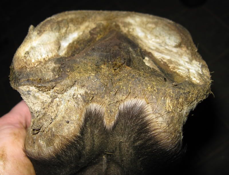- kopyto u konia zaniedbanego od pół roku: nie, nie stoi na ścianie wsporowej, zdjęcie takie sobie, robione w trakcie robienia, ściany są przycięte, poza tym ten koń ma dużo pracować i to od zaraz. W takim przypadku to ja wolę ściąć za mało, niż za dużo.