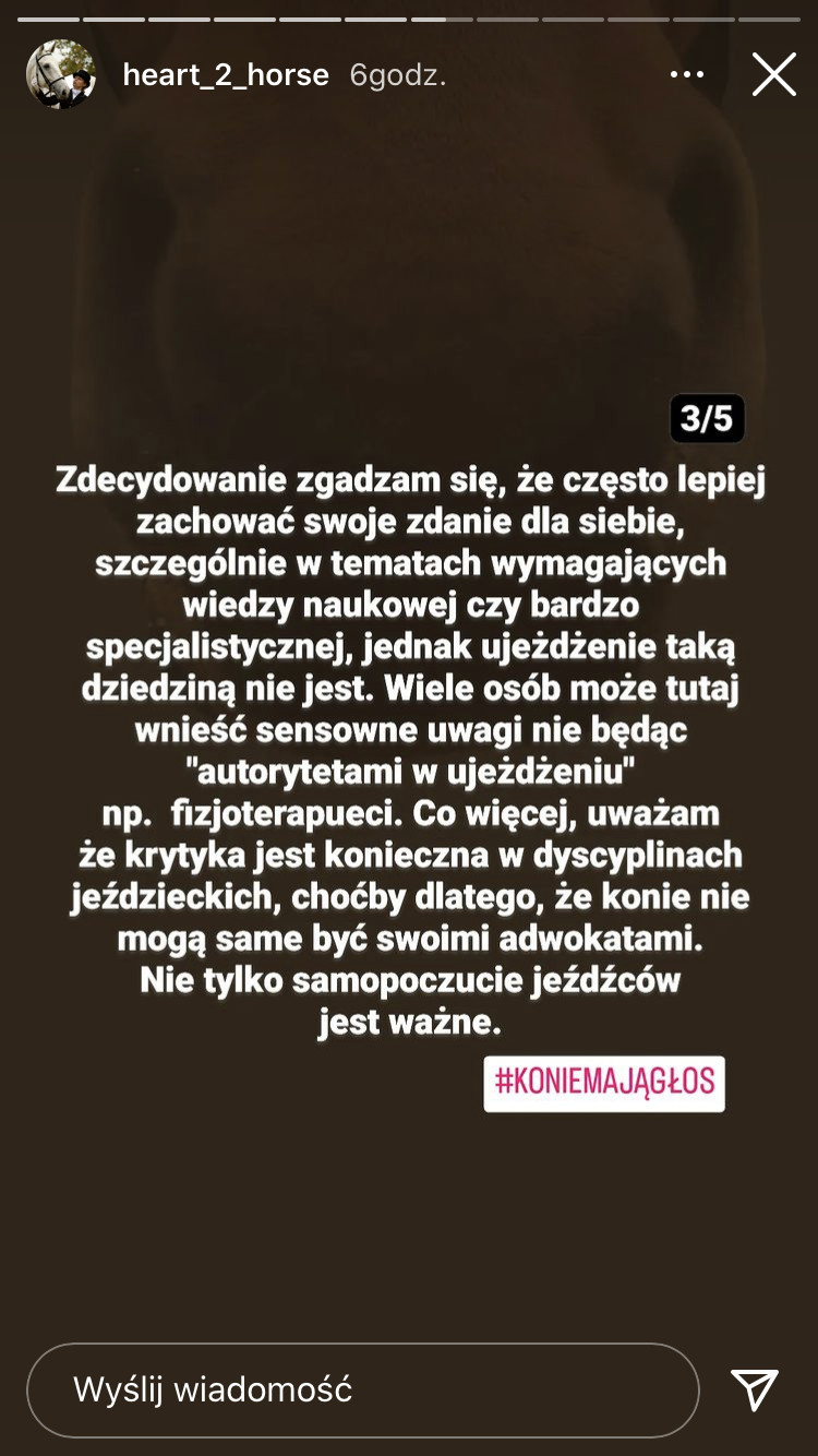 Muchozol2, nie mam problemu z mówieniem o końskim behawiorze, emocjach i tak dalej. Fajnie, że obecnie coraz więcej zwraca się na to uwagę. Natomiast to jak niewielkie ona ma pojęcie o rzeczach, których uczy innych, jest dość przerażajace.