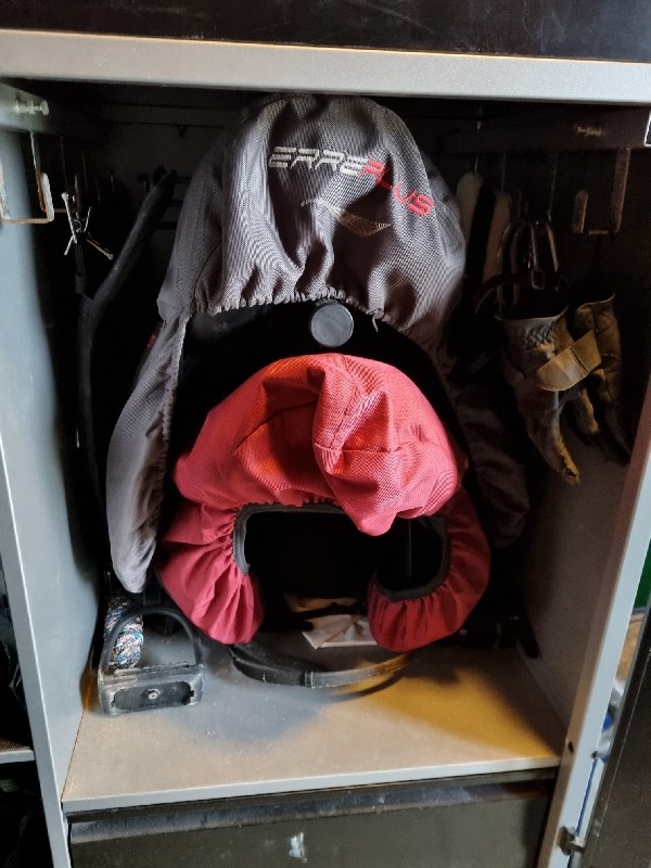 Po tych kilku dniach mam pierwsze przemyślenia takie, że podarowałabym sobie tę wewnętrzną szufladę, bo ona i tak jest mało funkcjonalna (trzymam w niej czapsy i ochraniacze - więcej się nie zmieści). To wszystko z szuflady równie dobrze mogłabym wrzucić w jakieś pudło/koszyk i postawić pod siodłami a miejsce na skrzynkę zostałoby jeszcze większe na 100%. Mimo że mierzyłam wszystko z zapasem to i tak siodła się mieszczą na styk, no ale najważniejsze, że się mieszczą. Docelowo pewnie zostanie mi tylko jedno, więc może tego dolnego wieszaka całkiem się pozbędę, ale na razie sobie wisi.
