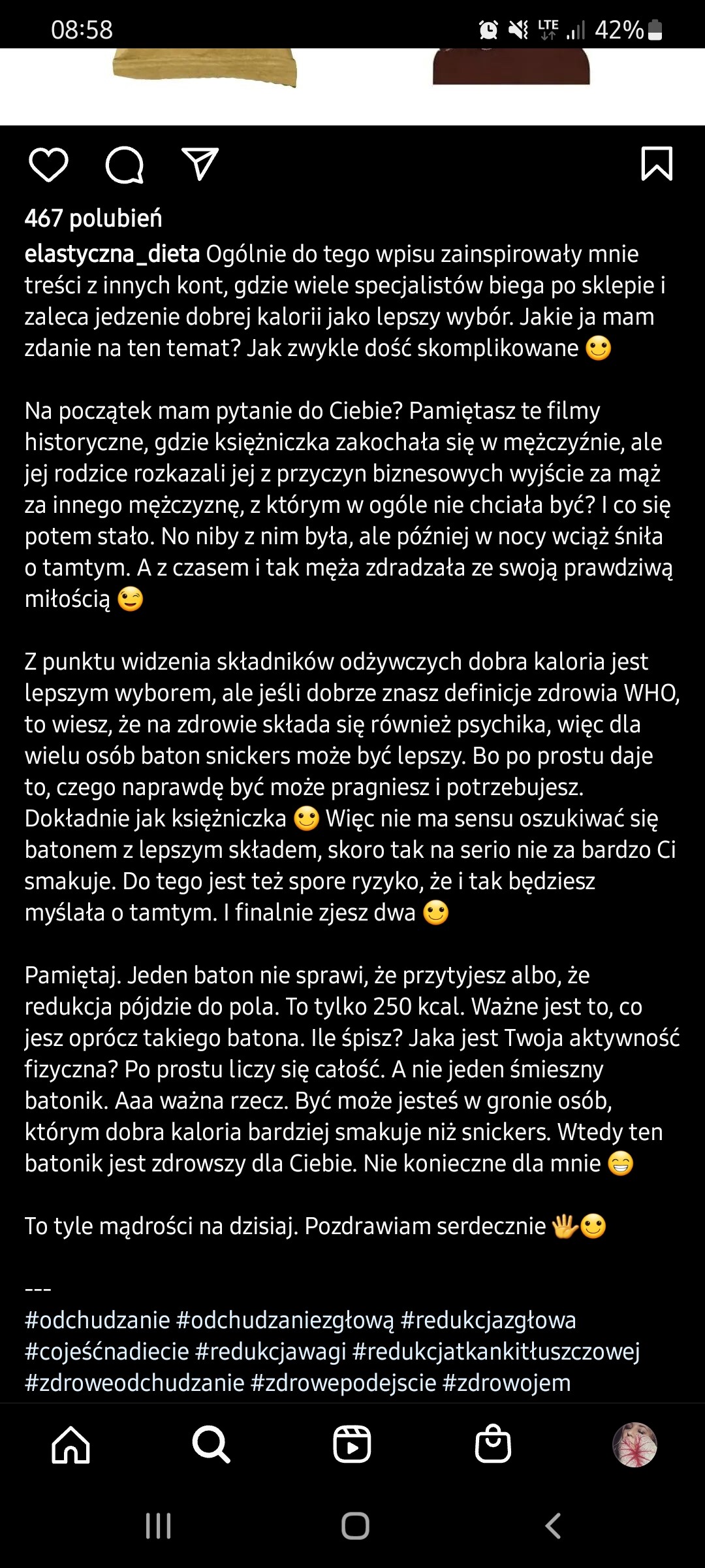 Co do "jak nie mam ochoty to nie zjem", to nie chodziło mi o żarcie słodyczy i serniczka 😅 a o to, że jak mam np. w dany dzień w diecie omlet, a ja nie chce nic smażonego i mam ochotę na owsiankę - to zjem owsiankę. Nie zmuszę się do omleta, jak sama myśl o nim mi staje już w gardle. Wymieniam posiłki między dniami, a wiadomo, czasem jest mniej kcal na śniadanie i więcej na obiad, czasem na odwrót. Jeśli wymieniam, to jest spora szansa, że po tygodniu wyjdzie więcej niż średnio 1800 kcal dziennie (albo mniej).