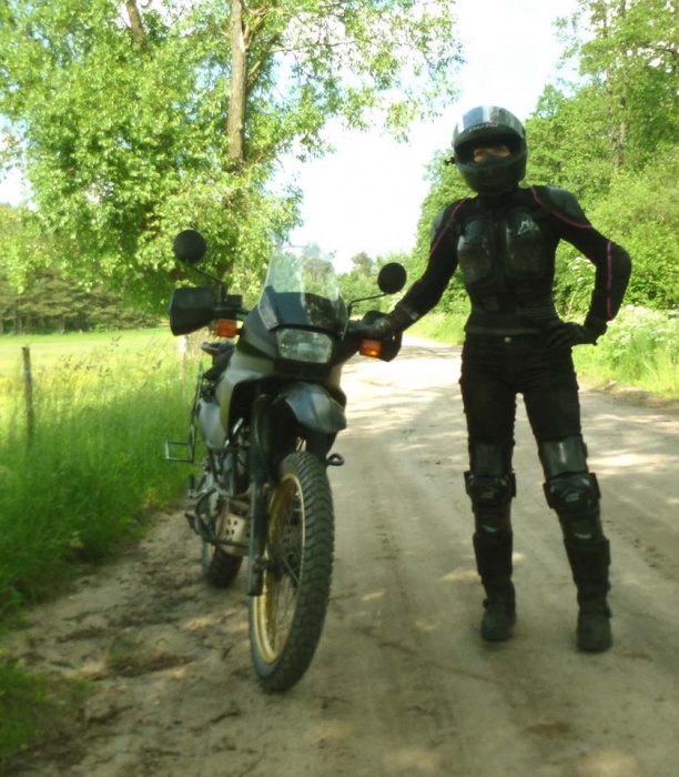A tą moją fotą to się tak nie zachwycajcie, bo to taki złudny obraz człowieka w takim czymś. Bo np buty i ochraniacze na nogach pogrubiają za chude kostki i łydki i prze to uda wyglądają na szczupłe. ( a wcale aż takie nie są) Buty są wysokie i zlewają się z ochraniaczem na kolanie i przez to noga wydaje się dłuższa niż normalnie. W pasie ściśnięta gumą, a nad pasem, szerokie plastiki poszerzające- co bardziej podkreśla pas. A przez wielki łeb w kasku cała sylwetka wydaje się być smuklejsza. Oszustwo! 😁 Ale jak któraś chce szyku zadać na mieście, to mogę stroik pożyczyć. Każdemu w nim pewnie byłoby nieźle. 😉