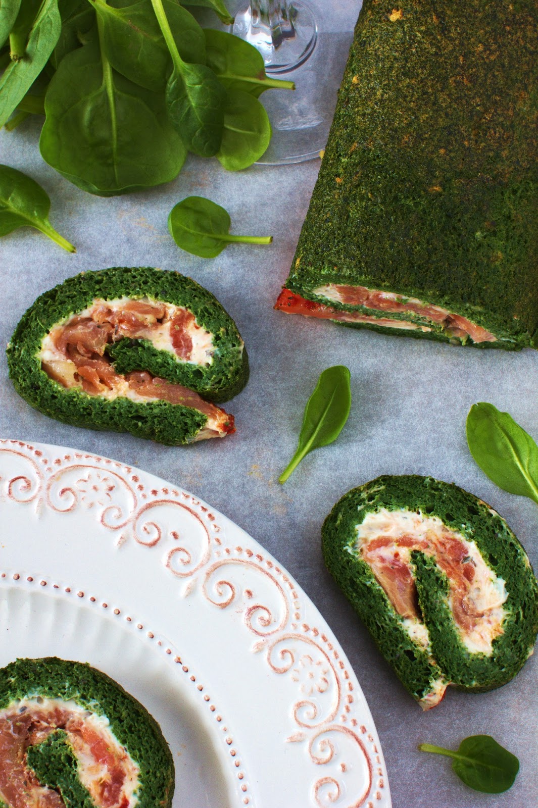 Na patelni podsmażamy z masłem szpinak i czosnek, sól, pieprz. odsączamy na sitku i studzimy. Żółtka dodajemy do szpinaku. Białka ubijamy na sztywno. Pianę dodajemy delikatnie do szpinaku, dysypujemy mąkę i mieszamy. Wylewamy na dużą blachę wyłożoną papierem do pieczenia i pieczemy 15 min. w 190 st. Przestygnięty placek smarujemy serkiem i na to układamy łososia tak aby pokrył całość. Zwijamy jak roladę i zawijamy ściśle w folię do żywności. Wkładamy do lodówki na kilka godzin.