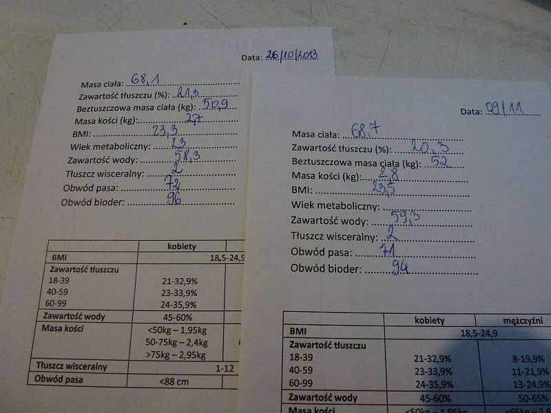 - przez tą znów większą wodę niż ostatnio, znów zaburzone wyniki. Na wadze wyszło, że mam 20,3 %tłuszczu, czyli PONIŻEJ normy. A same widziałyście wczoraj na fotach, że NIE wyglądam na osobą z tłuszczem poniżej normy. Tak więc, sama waga to nie wszystko! Potrzebny jeszcze ktoś, kto to będzie umiał zinterpretować