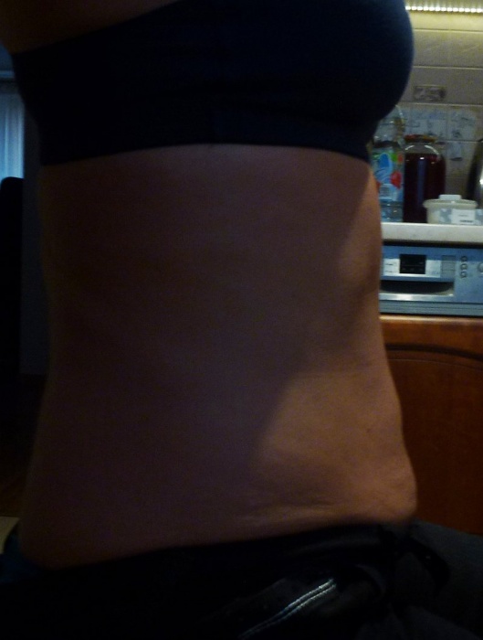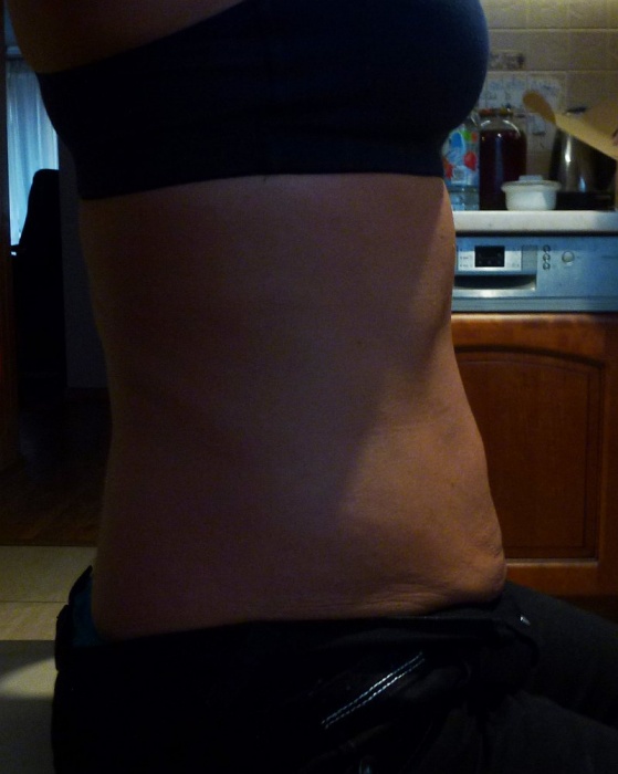 Aha, bo nie napisałam. Narazie mam taki okres, że za chiny ludowe ciało nie chce ćwiczyć (jedynie mózg, jak leżę na kanapie i wyobrażam sobie jak się pocę przy Jillian) więc staram się nie przytyć (jest bardzo ciężko). Na wiosnę uderzam znów atakiem na redukcję, bo jak już pokazujemy swoje "ułomności" ciała... To macie mój brzuch gdy siedzę wyprostowana, na wydechu, bez wciągania. Co z tego, że jak stoję, czy leżę to ładnie widać kosteczki i tłuszczyk się rozkłada? Jak siadam to jest armagedon. I wiem, że mam tam tłuszcz i chciałabym żeby zniknął chociaż jeszcze trochę. No ale ja na samej diecie nic narazie nie schudnę, nie potrafię aż tak ograniczyć kalorii. Muszę ćwiczyć, a że narazie nie mam na to ochoty (naprawdę nie mam juz takiej motywacji do ćwiczeń na powierzchni metr na metr i obijania się ciągle a to o komodę, a to o stół)... Zostawiam redukcję na wiosnę.