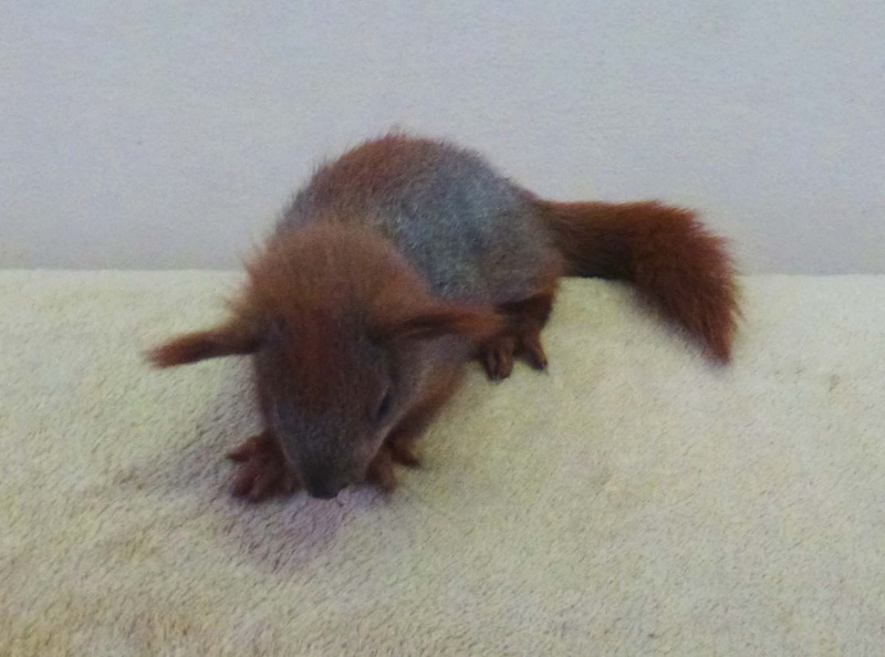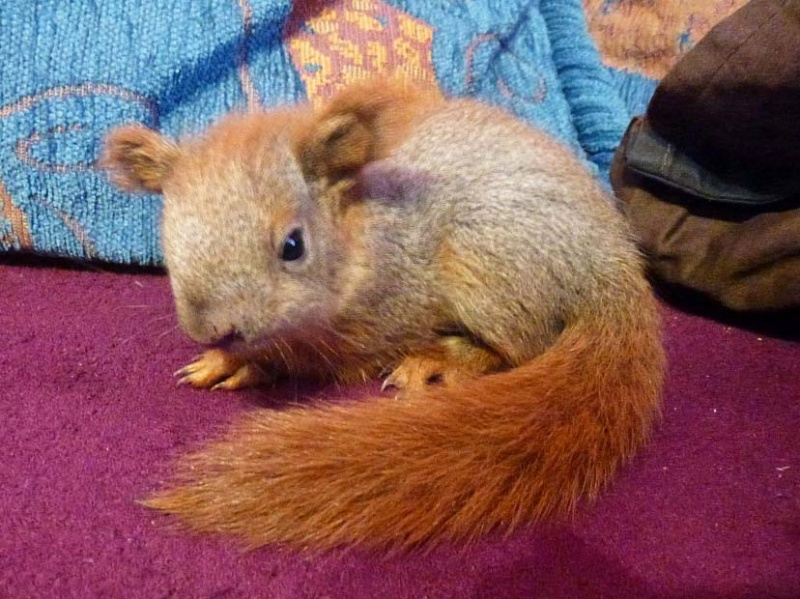 Od wczoraj mieszka z nami Czerwony Wiewiór. Uciekał przed kotem i wpadł mężowi do garażu, między nogi. Miał rozkrwawiony nos i ledwo zipał. Dziś już je jabłko i gania po domu i po klatce. Nie boi się ludzi, tuli się, dużo śpi. Jest jeszcze mały. Zostanie u nas.