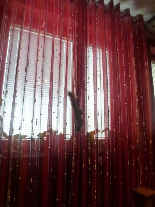 I próbowała wyjść bokiem a nie dołem. Niestety...gładkie meble nie pozwalają się wczepić pazurami.