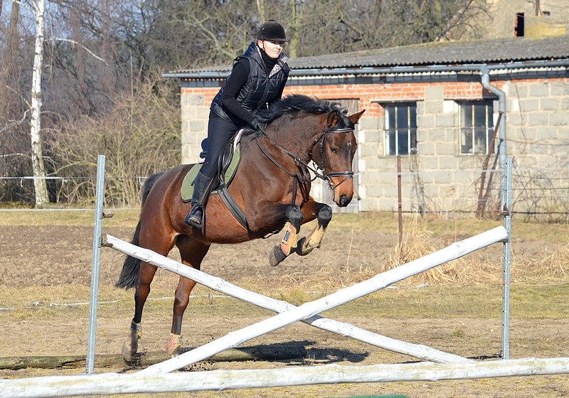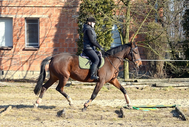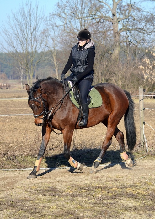 A my ruszyliśmy od początku roku z kopyta i realizowaliśmy się terenowo (ujeżdżalni brak niestety), a ostatnio dopadło mnie jakieś dziwne choróbsko, już dwa tygodnie mam tak osłabiony organizm, że wyczyszczę konia i poty mnie zalewają, dyszę jak lokomotywa... ech... No ale ile daję radę to Elf bryka na lonży chociaż, a że niedaleko stajni mamy świetne miejsce na lonże - łąka, i w jednym rogu zniekształcona jest tak śmiesznie, że potworzyły się górki, pagórki no i jest gdzie pobrykać, ostatnio myślałam, że pofrunę razem z lonżą, jak odpalił wrotki i zad fruwał na wszystkie strony 😀