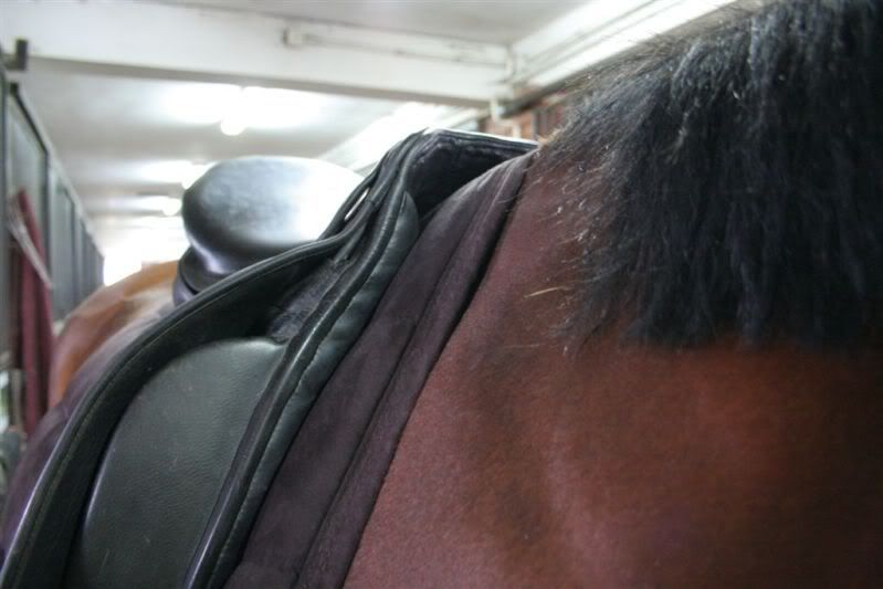 baffinka- moim zdaniem siodło mogłoby być ciuteńkę szersze z przodu, ale chyba w sumie od biedy może być. Za to panele jak widać nie przylegają do konia jak należy i należałoby je w takim razie lekko dopchać. W tych miejscach gdzie jest sucho. Bo tak jak jest teraz, to największy ciężar koń dźwiga na tylnej części grzbietu, nie?