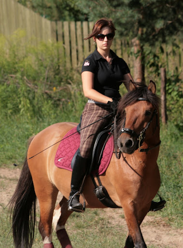 edit: żeby nie było nieporozumień (patrz post niżej) klacz na zdjęciach NIE JEST zebrana. Miały one pokazać poprawę w noszeniu głowy - wcześniej nos był dokładnie w poziomie. Jej "zbieranie się" polega na bardzo krótkotrwałym podstawianiu zadu, po czym przypomina sobie, że ma się zrobić wklęsła. Niestety, klacz już długo chodzi w rekreacji, a jest bardzo wrażliwa w pysku i grzbiecie, więc została mocno "zepsuta". Klacz nie jest moja i jeżdżę na nie dość rzadko, więc wszystko co na niej wypracuję do następnej jazdy znów zostaje rozwalone...