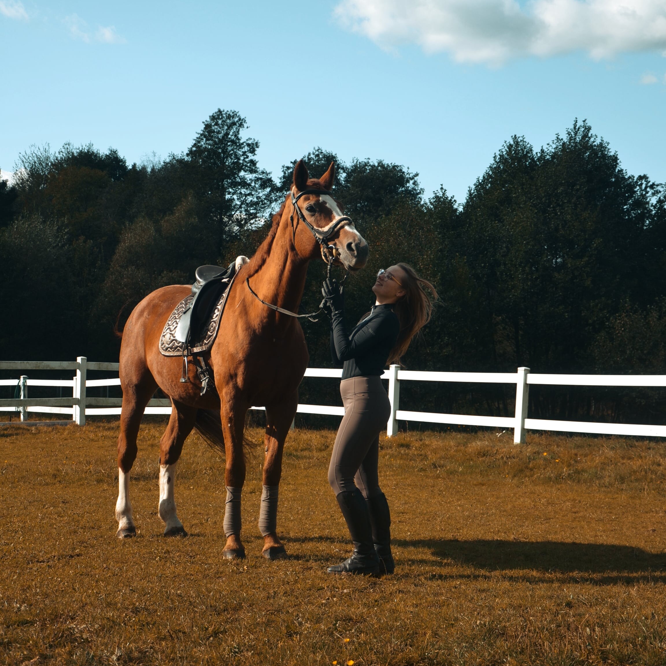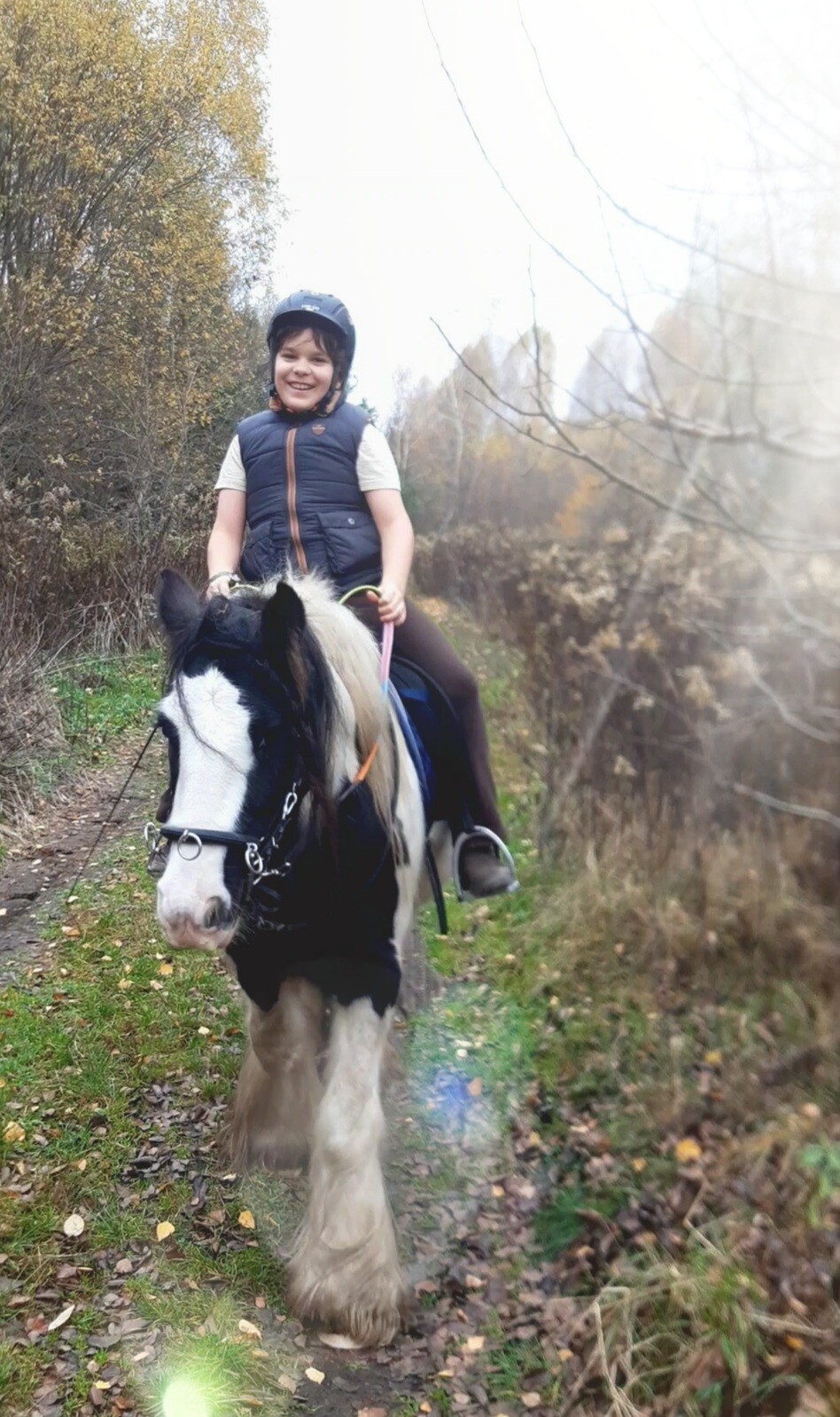 Jeździ ze mną czasami w teren, spędzamy razem dużo czasy w stajni bo ja ogarniam resztę stadka jak młody jeździ.