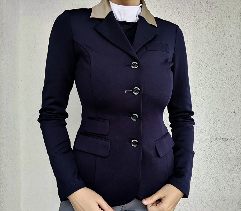Frak jeździecki esperado. Granatowy z beżowym kołnierzykiem i bezowym przeszyciem po boku . Wygląda mega elegancko i stylowo. Bardzo wygodny, elastyczny. Slicznie układa się na sylwetce, taliowany. Kieszonki są pełne. Stan jest bardzo dobry, nie ma metki zdjecie pogladowe modelu jak lezy na osobie. Rozmiar XS szerokośc 42cmx2, dł całkowita od ramienia i dł rękawa 60cm