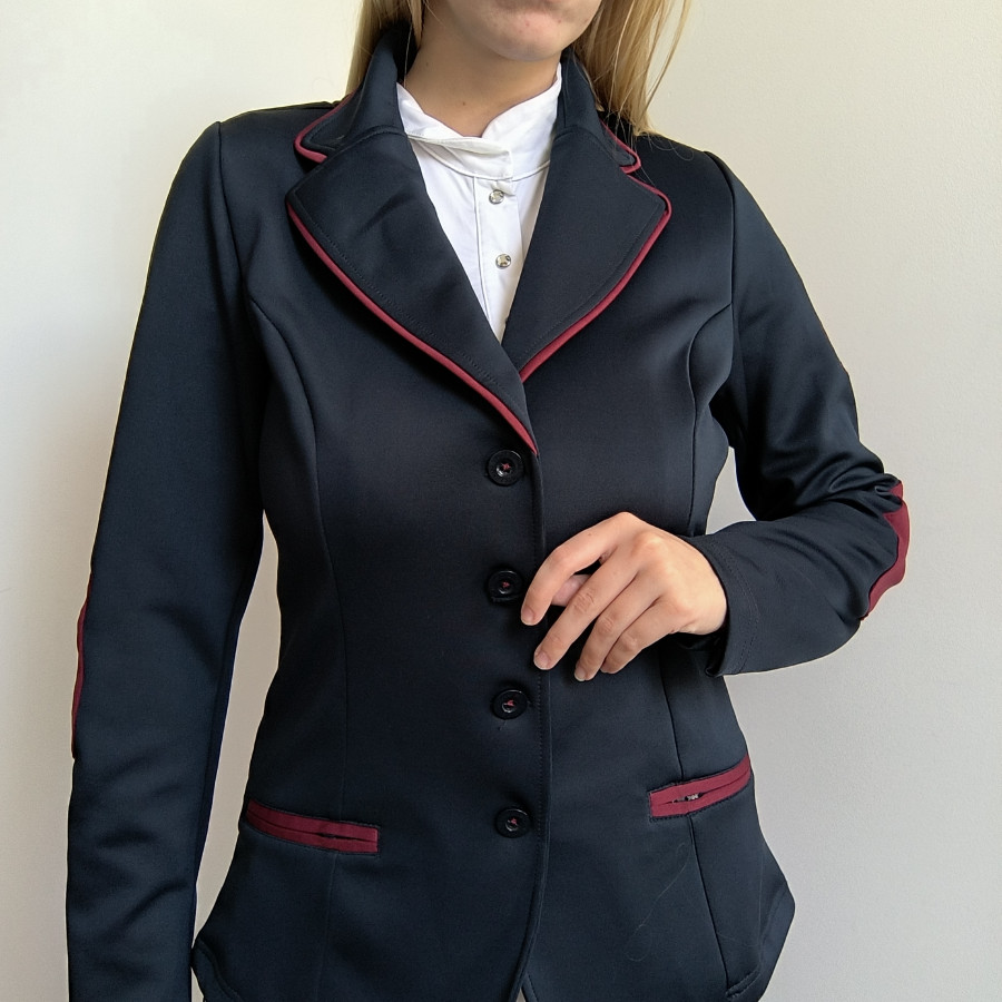 Frak jeździecki Felix Bühler. Granatowy Z bordowymi przeszyciami. Wizualnie otwiera barki. Łatki na łokciach w kolorze. Rękawki są regulowane na zameczek możesz rozszerzyć lub zwęzić. Ma pełne kieszonki na zamek kryty Bardzo elastyczny i wygodny. Komfortowy podczas noszenia. stan bardzo dobry Rozmiar M szerokość 47 cm x2 dl całkowita od ramienia i rękawa 64 cm