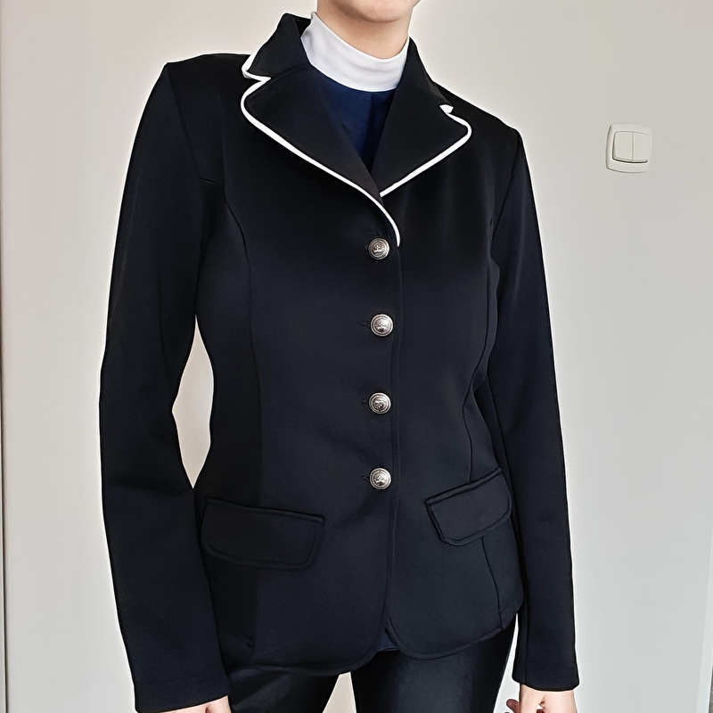 Frak jeździecki Felix Bühler. Czarny . Super wygodny i elastyczny. Ładnie układa się na sylwetce. Z białymi elementami. Stan bardzo dobry. Kieszonki pełne. Rękawki regulowane dodatkowo na zamek(można poszerzyć lub zwęzić)