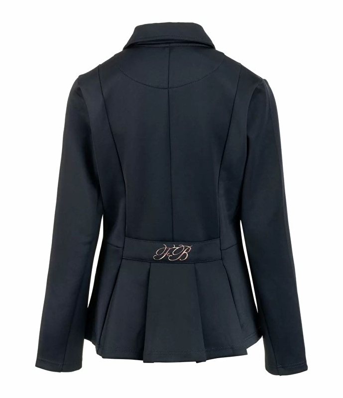 Elegancka dziecięca marynarka konkursowa z detalami w kolorze różowego złota i dopasowanym krojem. Szczególnie elastyczny i łatwy w pielęgnacji materiał rozciągliwy w 4 kierunkach. Oddychająca i szybkoschnąca. Misternie zaprojektowany marszczony tył z metalowym nadrukiem Felixa Bühlera w kolorze różowego złota. Z przodu 2 kieszenie zapinane na suwak i guziki w kolorze różowego złota. 95% poliester, 5% elastan.