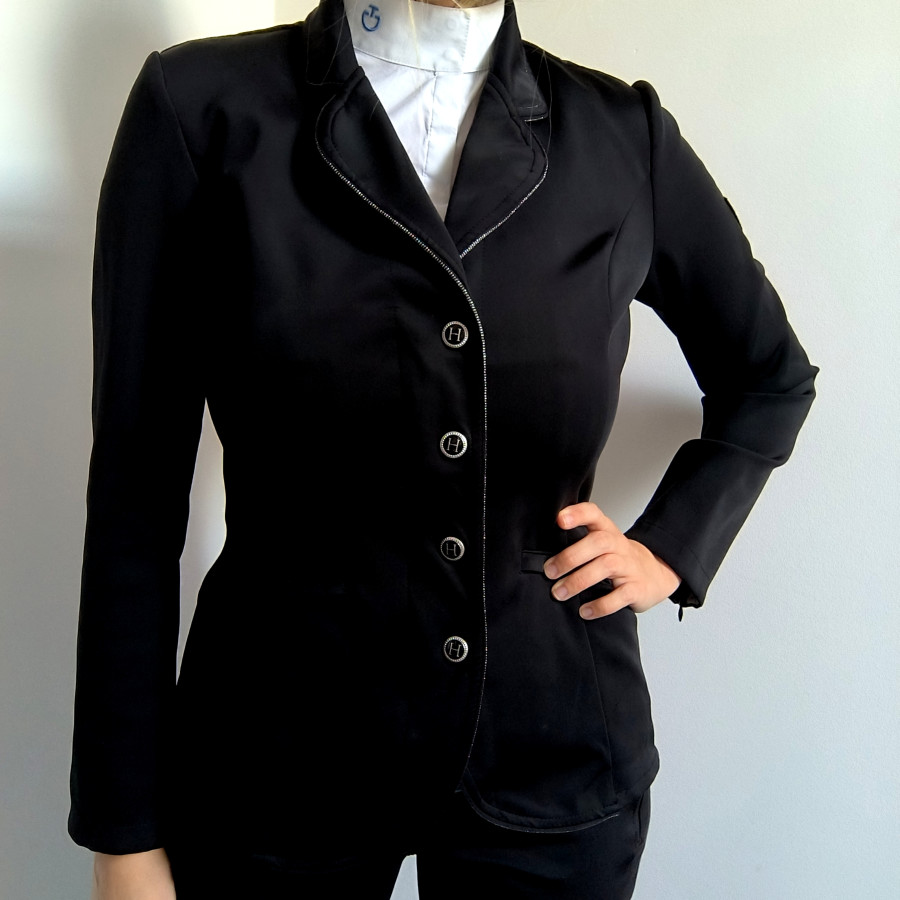 Frak jeździecki Harcour.czarny z ładnym delikatnymi srebrnymi przeszyciami. Nowszy model. Jest bardzo wygodny..podwójnie zapinany. Na zamek i napy. Frak super wygodny ultra komfortowy. Nie uwiera a ładnie dopasowuje się do sylwetki. Taliowany pięknie wygląda po założeniu. Ma kieszenie nazamek kryte. Rękawki są na zamek wiec ich szerokość możesz regulować. Zdecydowanie frak warty uwagi. Stan bardzo dobry. Rozmiar S szerokość 43 cmx2 dl całkowita od ramienia 62 cm Dl rękawa 57 cm od pachy 45 cm