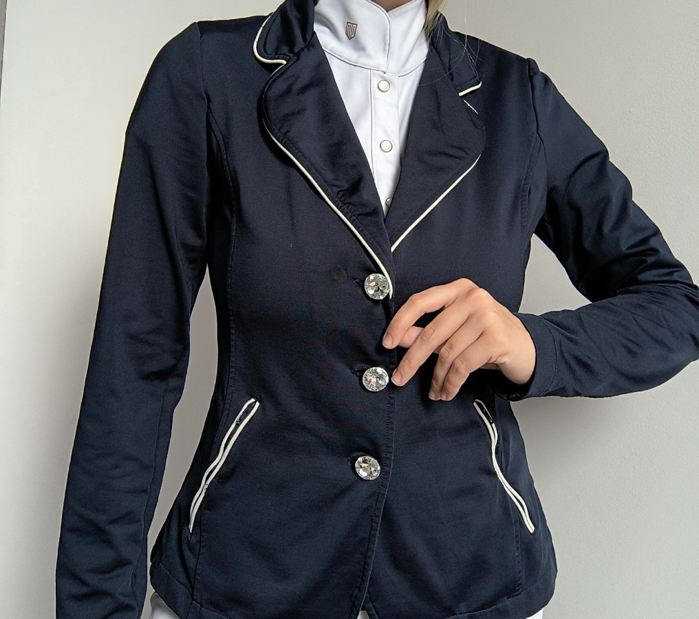 frak jeździecki horka. Granatowy Termo podszyty polarem na sezony halowe. Fajnie dogrzewa a jednocześnie przy tym jest bardzo elastyczny i łatwy w dopasowaniu. Lekki oraz wygodny. Stan bardzo dobry należy wyprać. Rozmiar M szerokość 47 cm x2 dl całkowita od ramienia 60 cm Dl rękawa 62 cm