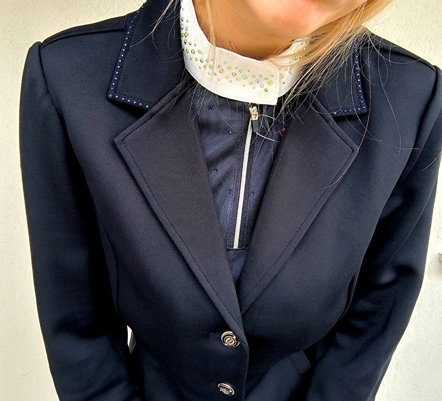 Frak konkursowy jeździecki Imperial riding. Granatowy Przepięknie wykonany,tym razem z kryształkami na kołnierzu , bardzo subtelny. Do tego jest niesamowicie elastyczny i wygodny, nigdzie nie uwiera, jest świetny ! Zdecydowanie go mogę polecić. Do fraka dołączony jest pokrowiec i wieszak. Nigdy nie używany. Nowy z metką Mega frak w mega cenie.