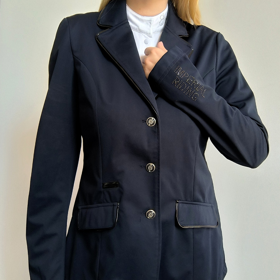 Frak jeździecki imperial riding. Granatowy z Ala skórzanymi lateksowymi wstawkami mieniącymi się. Ma też świetne logowanie na rękawie z zdobieniami które dodatkowo sprawia że frak jest inny niż wszystkie. Softshell materiał nie brudzi się i jest łatwy w czyszczeniu. Taliowany. Bardzo ładny i ciekawy. Fajnie dopasuje się do sylwetki. Sprzedawany z pokrowcem i wieszakiem. Nowy z metką. Rozmiar Xl