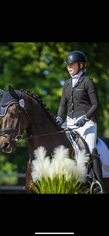 Frak jeździecki Clematis został wykonany z elastycznej takniny. Jest lekki, oddychający, rozciągliwy i szybkoschnący. Frak posiada zdobienia w postaci kryształków. Zapinany na 4 guziki z grawerem korony.