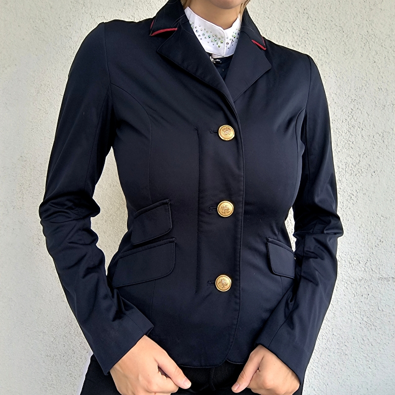 Frak jeździecki konkursowy Jh collection. Sofyshellowy nie łapie brudu. Z złotymi elementami i czerwonymi wstawkami na kolnierzu. Chwyta za oko. Super skrojony. Kieszenie to atrapy. Wygodny. Zapinany podwójnie na zamek i guziki. Stan ogólny bardzo dobry. Rozm 34 szerokość 42 cm x2 dl całkowita od ramienia 58 cm Dl rękawa 60 cm