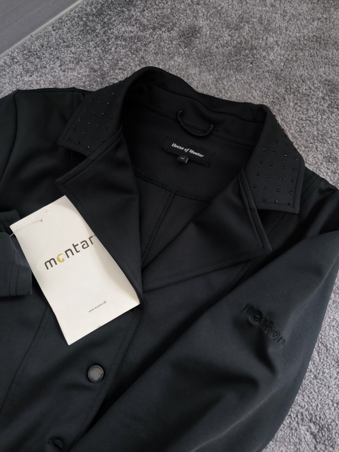 Frak jeździecki montar..czarny. jeśli szukasz wyjątkowego fraka ale jak najbardziej prostego to koniecznie spójrz na ten właśnie egzemplarz! Mimo prostosty w designie wyróżnia się krysztalkami wokół kołnierza oraz z tyłu na plecach. Wygląda to zjawiskowo i przepięknie się mieni nadając Frakowi dodatkowego wdzięku. Materiał jest Softshellowy , brud do niego nie przyczepia się. Jest łatwy w czyszczeniu. Kieszenie na zamek kryte. Frak ładnie układa się na sylwetce. Nowy z metką. Zdecydowanie warty uwagi. Rozmiar z metki to 42 xl jednak producent wspomina że jest to zawyżony rozmiar i najlepiej pasuje na L 40. Szerokość 50 cm x2 dl całkowita od ramienia i rękawa 64 cm.. cena katalogowa około 600 zł