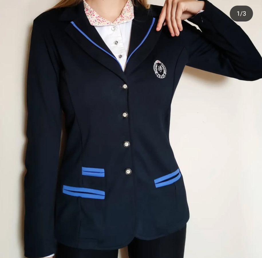 Frak jeździecki Spooks. Granatowy z niebieskimi elementami. Starsza kolekcja ale bardzo wygodny frak wart polecenia pod tym względem. Rękawki na zamek regulowane. Kieszenie wkładane. Bardzo ładnie układa się na sylwetce. Stan ogólny bardzo dobry używany.nnapewno należy go wyprac całego. Może mieć lekkie ślady użytkowania. Rozmiar S szerokość 46 cm x2 dl całkowita od ramienia 62 cm Dl rękawa od pachy 50 cm