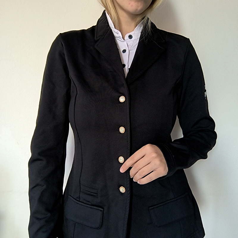 Frak jeździecki Spooks. Czarny. Ich fraki cechują się świetnym materiałem. Jest bardzo wygodny nie uwiera łatwo się dopasowuje jest przyjemny. Zdecydowanie świetny frak. Elastyczny. Stan bardzo dobry. Rozmiar M szerokość 48 cm x2 dl całkowita od ramienia 61 cm Dl rękawa 63 cm