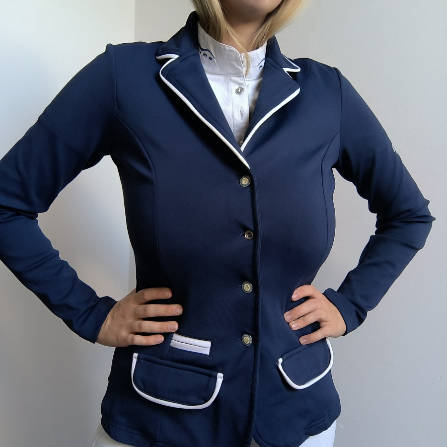 Frak jeździecki Spooks. Granatowo niebieski z białymi elementami. bardzo wygodny frak wart polecenia pod tym względem. Rękawki na zamek regulowane. Kieszenie wkładane. Bardzo ładnie układa się na sylwetce. Stan ogólny bardzo dobry, brak na jednym guziku Może mieć lekkie ślady użytkowania. Rozmiar S szerokość 46 cm x2 dl całkowita od ramienia 62 cm Dl rękawa od pachy 50 cm