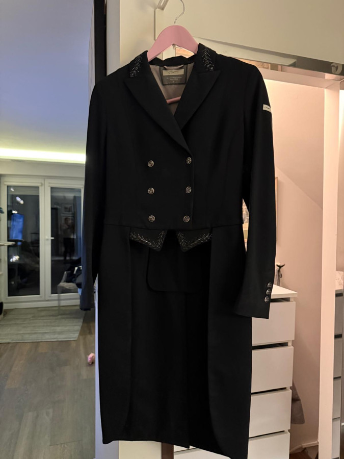 Pięknie zdobiony, w stanie bardzo dobrym frak ujedzeniowy Animo. Rozmiar włoski 42, wypada jak S/M. Kolor czarny.