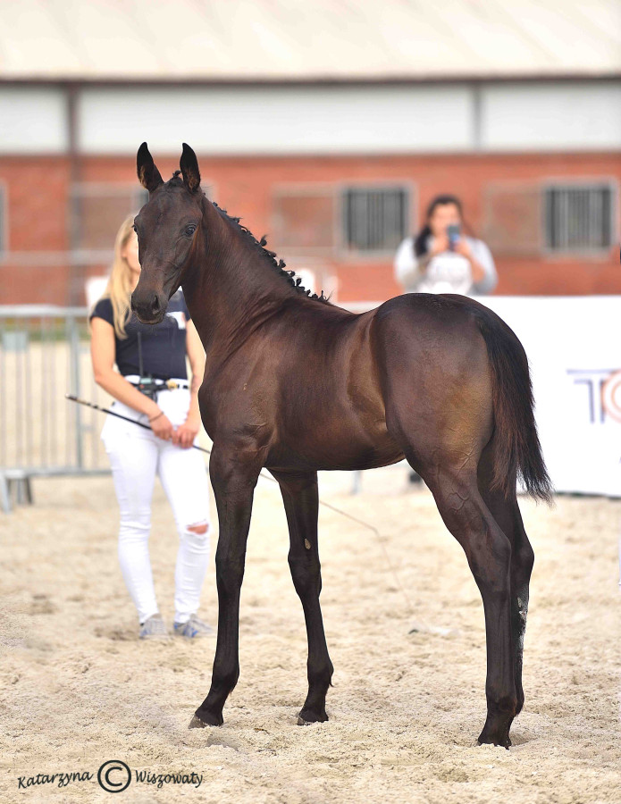 Klaczka jest elegancka, harmonijnie zbudowana, z poprawnymi nogami i dużą swobodą ruchu. Odważna, ufna, łatwa w codziennym kontakcie - łączy w sobie sportowy potencjał z przyjaznym charakterem.