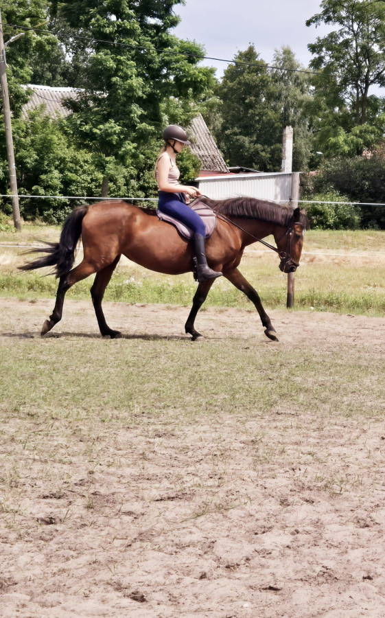 Gniada klacz rasy Cruzado. Hiszpański paszport. 16 lat. Klacz elektryczna na placu. Idealna w tereny, zawsze jako prowadząca, bomboodporna. Bezproblemowa przy zabiegach pielęgnacyjnych i weterynaryjnych. Ma problemy z podawaniem tyłów kowalowi, jednak jest to do przepracowania. Przy regularnej pracy robi wszystko bezproblemowo. Koń dla osoby doświadczonej, do hodowli, wyjazdów w teren lub pracy z ziemi, lub po prostu do towarzystwa.