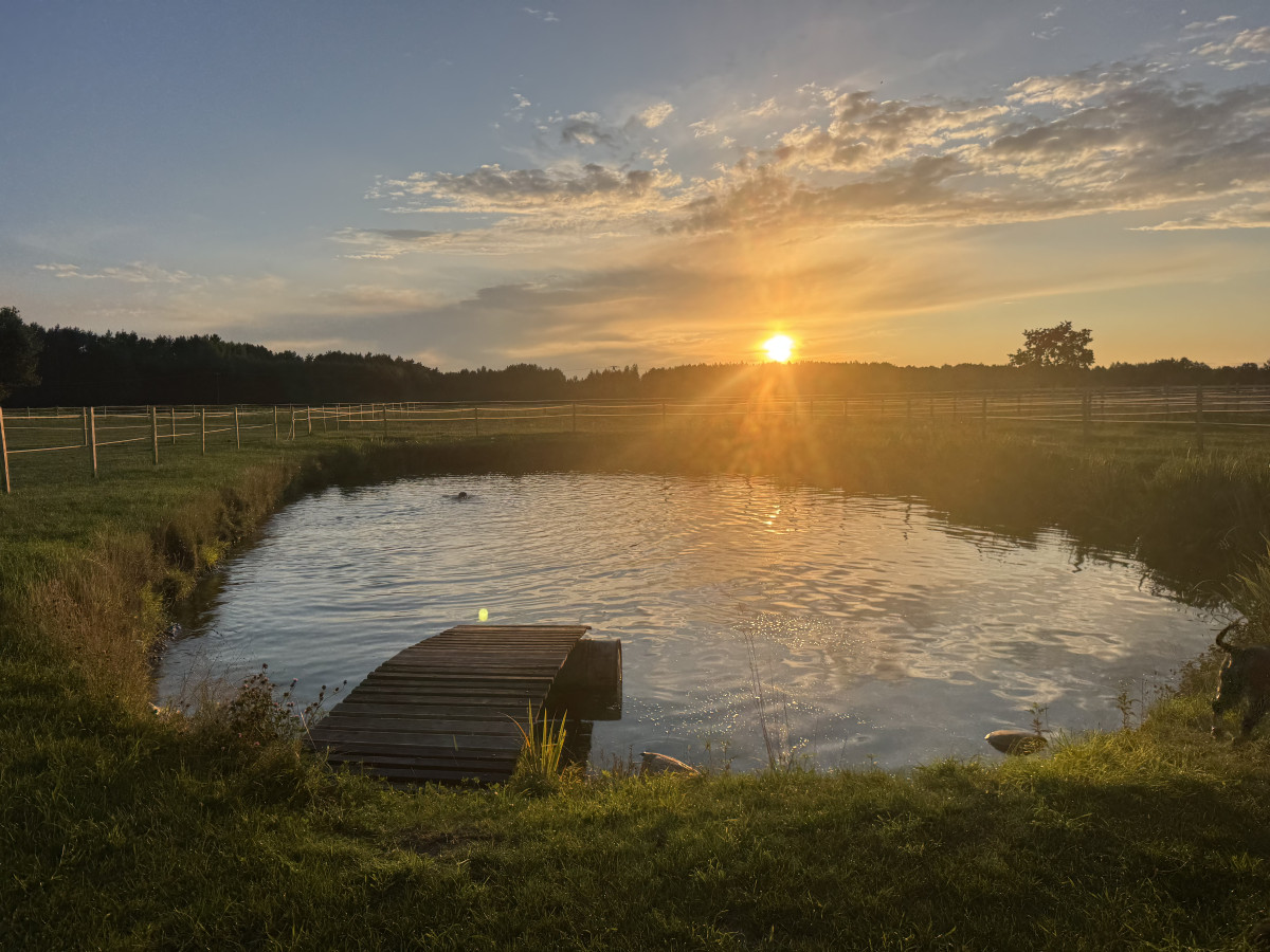 Bezpośredni wyjazd do lasu i piękne tereny. Staw na własność, a nad jezioro dotrzeć można w siodle.