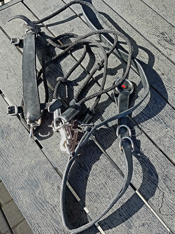 Gogue jest to patent do lonżowania konia przypominający chambon. Wywiera nacisk na potylicę gdy koń chce podnieść głowę. Zaletą jest to, że nie podciąga kącików pyska do góry, a dzięki sznurkom i karabińczykom nie blokuje konia w jednej pozycji. Duża możliwość regulacji (rozmiar Full), wszystkie sprzączki i karabińczyki w idealnym stanie.