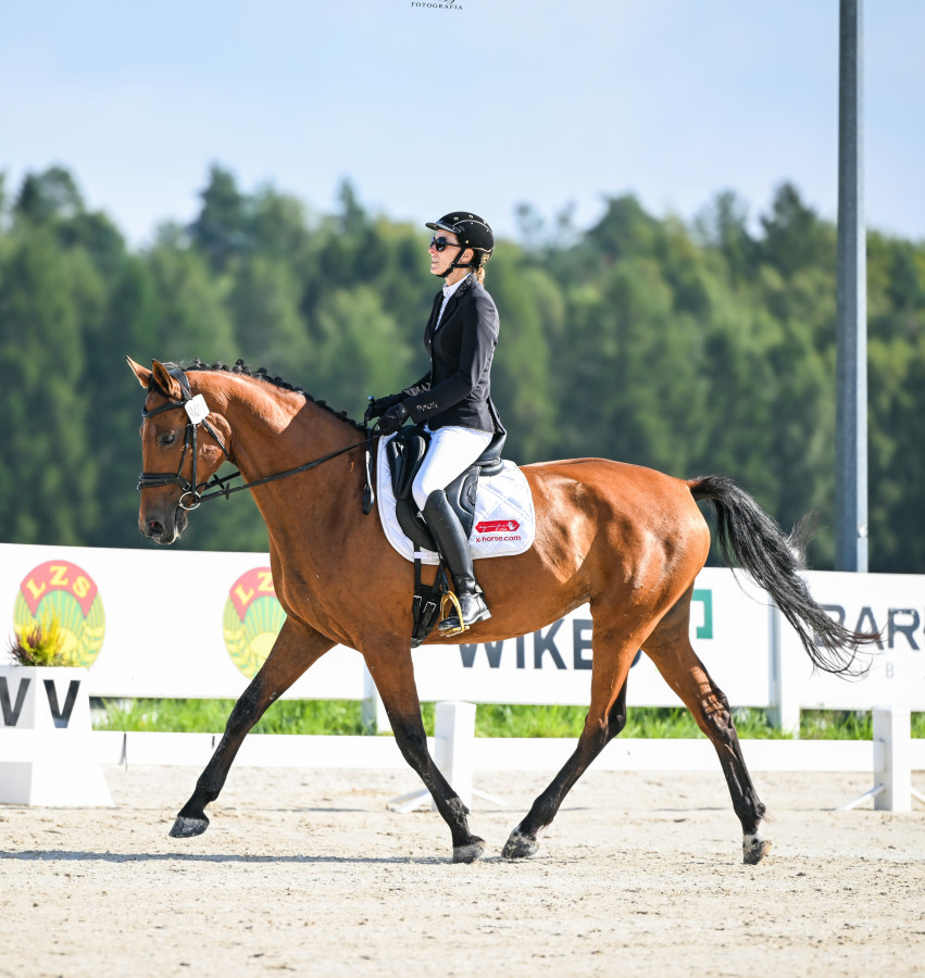 Klacz jest w stałym treningu ujeżdżeniowym, aktualnie na poziomie P/N, poszerzenia wykroku i ustępowania od łydki, kontrgalop. Charakteryzuje się niezwykle dobrą równowagą, stabilnością na kontakcie i równomiernymi zgięciami w obie strony. Jest bardzo łatwa do jazdy, delikatna, spokojna, bezpieczna i odważna. Bezproblemowa w obsłudze, w transporcie i podczas treningów wyjazdowych.