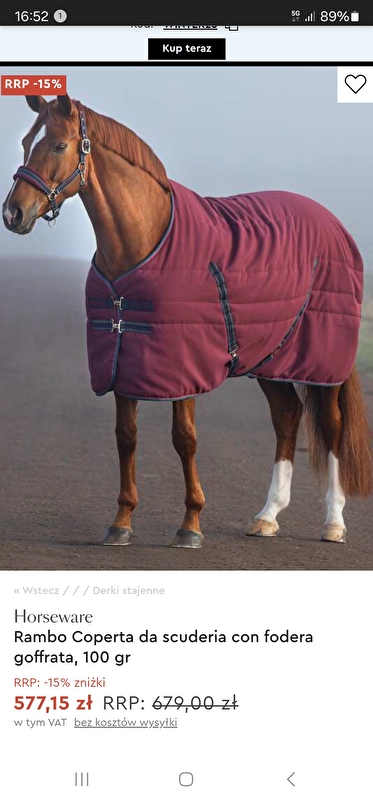 Sprzedam nową derkę stajenną firmy horseware rambo. Derka o wypełnieniu 100g, ciepła. Rozmiar 140 cm, 6'3''. Stan idealny, nowy. Cena nowej ponad 600 zł.